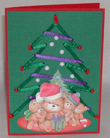 Pakket bestaat uit: 2 vellen karton, 1 knipvel, prikmal,       werkbeschrijving, foamtape, lint, garen, pompoentjes en naald.