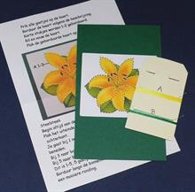 Compleet pakketje met kaartje, kaartje met patroon,           werkbeschrijving, borduurgaren en naald.