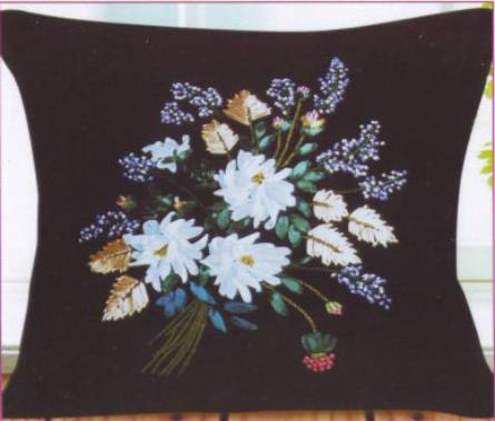 Compleet pakket met garen, linten, naalden, kussensloop en werkomschrijving.