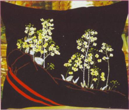 Wit/gele bloemen op zwart kussen.