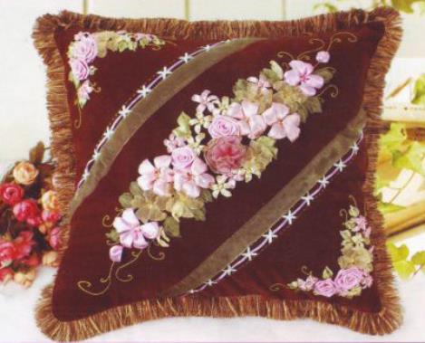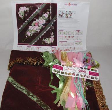 Compleet pakket met garen, linten, naalden, werkomschrijving en kussensloop.