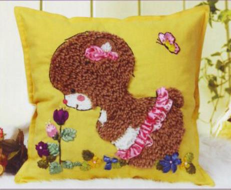 Compleet pakket met garen, linten, naalden, werkomschrijving en kussensloop.