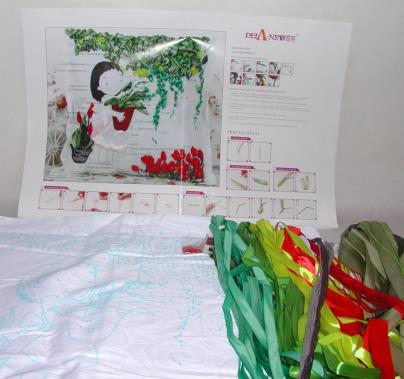 Compleet pakket met garen, linten, naalden, werkomschrijving en kussensloop.