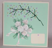 Pakket bestaat uit: 2 vellen karton, 1 knipvel, prikmal,       werkbeschrijving, foamtape, lint en naald.