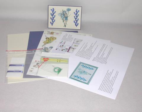 Pakket bestaat uit: 2 vellen karton, 1 knipvel, prikmal,       werkbeschrijving, foamtape, lint, garen, kraaltjes en naald.
