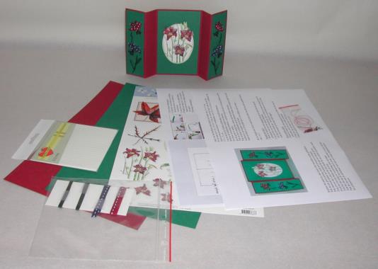 Pakket bestaat uit: 2 vellen karton, 1 knipvel, prikmal, werkbeschrijving, foamtape, lint, garen, kraaltjes en naald.