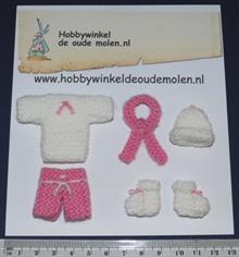 trui 58 x 40 mm, broek 30 x 30 mm, das 30 x 40 mm, muts 25 x 25 mm, slof 20 x 20 mm