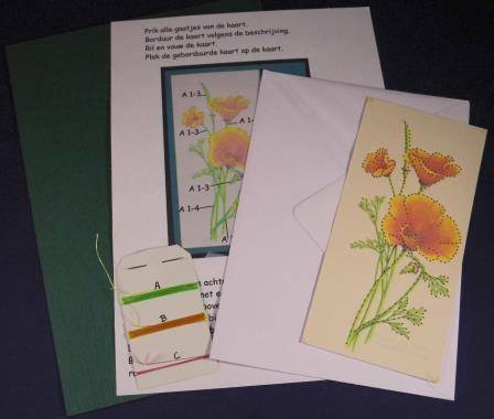 Compleet pakket met kaart + envelop, kaartje met patroon + werkbeschrijving, borduurgaren + naald.