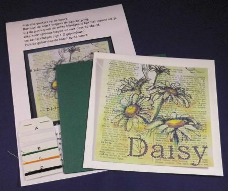 Compleet pakket met kaart + envelop, kaartje met patroon + werkbeschrijving, borduurgaren + naald.