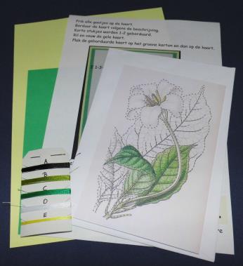 Compleet pakket met kaart + envelop, kaartje met patroon + werkbeschrijving, borduurgaren + naald.