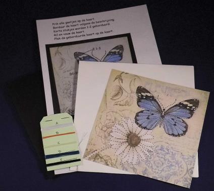Compleet pakket met kaart + envelop, kaartje met patroon + werkbeschrijving, borduurgaren + naald.