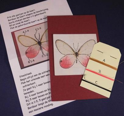 Compleet pakketje met kaartje, kaartje met patroon,           werkbeschrijving, borduurgaren en naald.