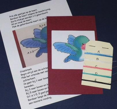 Compleet pakketje met kaartje, kaartje met patroon, werkbeschrijving, borduurgaren en naald.