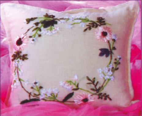 Bloemenkrans op creme kussen.