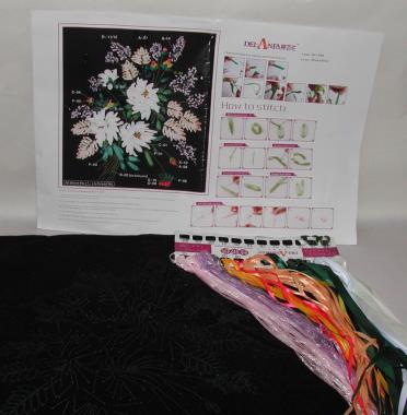 Compleet pakket met garen, linten, naalden, kussensloop en werkomschrijving.