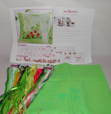 Compleet pakket met garen, linten, naalden, werkomschrijving en kussensloop.