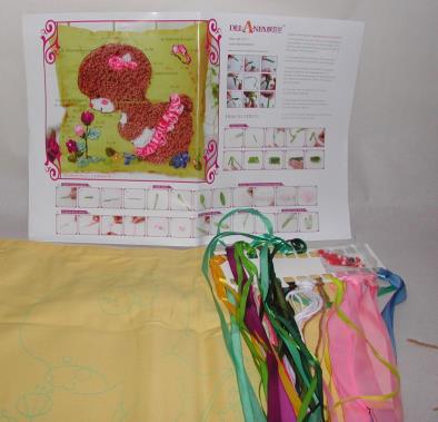 Compleet pakket met garen, linten, naalden, werkomschrijving en kussensloop.