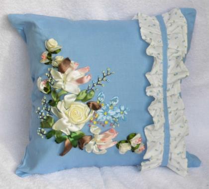 Compleet pakket met garen, linten, naalden, werkomschrijving en kussensloop.