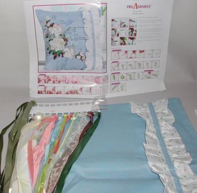 Compleet pakket met garen, linten, naalden, werkomschrijving en kussensloop.