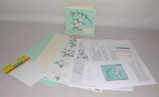 Pakket bestaat uit: 2 vellen karton, 1 knipvel, prikmal,       werkbeschrijving, foamtape, lint en naald.