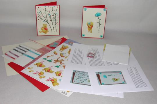 Pakket bestaat uit: 2 vellen karton, 1 knipvel, prikmal,       werkbeschrijving, foamtape, lint, garen, kraaltjes, pailletten                        en naald.
