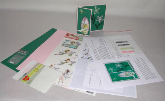 Pakket bestaat uit: 2 vellen karton, 1 knipvel, prikmal, werkbeschrijving, foamtape, lint, garen, kraaltjes en naald.
