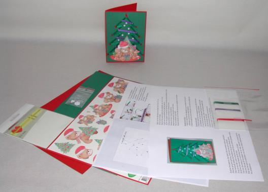 Pakket bestaat uit: 2 vellen karton, 1 knipvel, prikmal,       werkbeschrijving, foamtape, lint, garen, pompoentjes en naald.