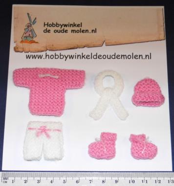 trui 58 x 40 mm, broek 30 x 30 mm, das 30 x 40 mm, muts 25 x 25 mm, slof 20 x 20 mm