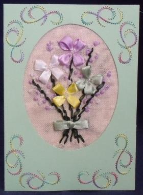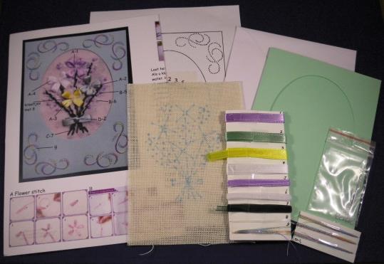 compleet pakket met werkbeschrijving, prikpatroon, kaart, envelop, stofje met patroon, garen, linten, kraaltjes en naalden