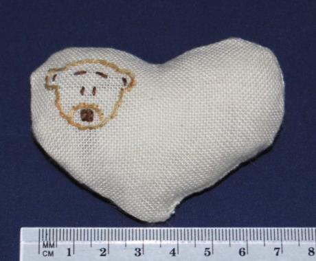 Compleet pakket met stof met patroon, werkbeschrijving, naalden, vulling en garen. Afmeting ongeveer 75 x 55 mm.
