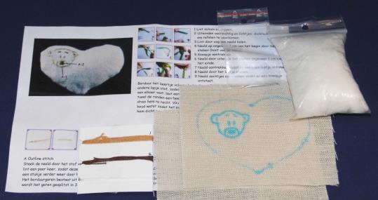 Compleet pakket met stof met patroon, werkbeschrijving, naalden, vulling en garen. Afmeting ongeveer 75 x 55 mm.