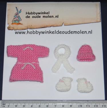 jurk 55 x 50 mm, das 30 x 40 mm, muts 25 x 25 mm, slof 20 x 20 mm