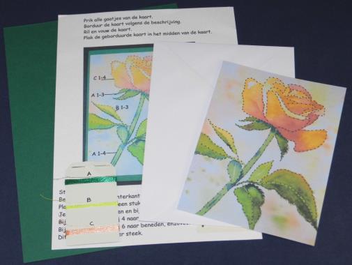Compleet pakket met kaart + envelop, kaartje met patroon + werkbeschrijving, borduurgaren + naald.
