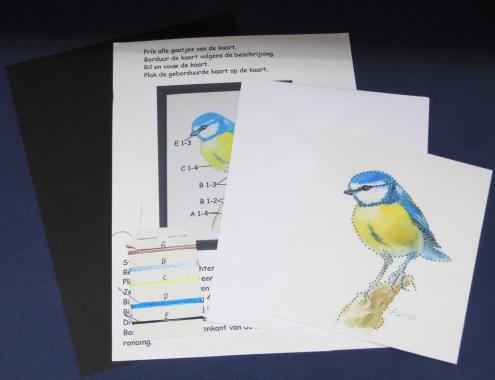 Compleet pakket met kaart + envelop, kaartje met patroon + werkbeschrijving, borduurgaren + naald.