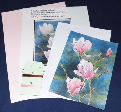 Compleet pakket met kaart + envelop, kaartje met patroon + werkbeschrijving, borduurgaren + naald