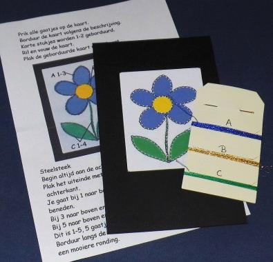 Compleet pakketje met kaartje, kaartje met patroon,           werkbeschrijving, borduurgaren en naald.