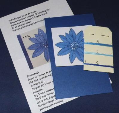 Compleet pakketje met kaartje, kaartje met patroon, werkbeschrijving, borduurgaren en naald.