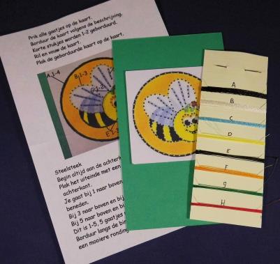 Compleet pakketje met kaartje, kaartje met patroon,          werkbeschrijving, borduurgaren en naald.